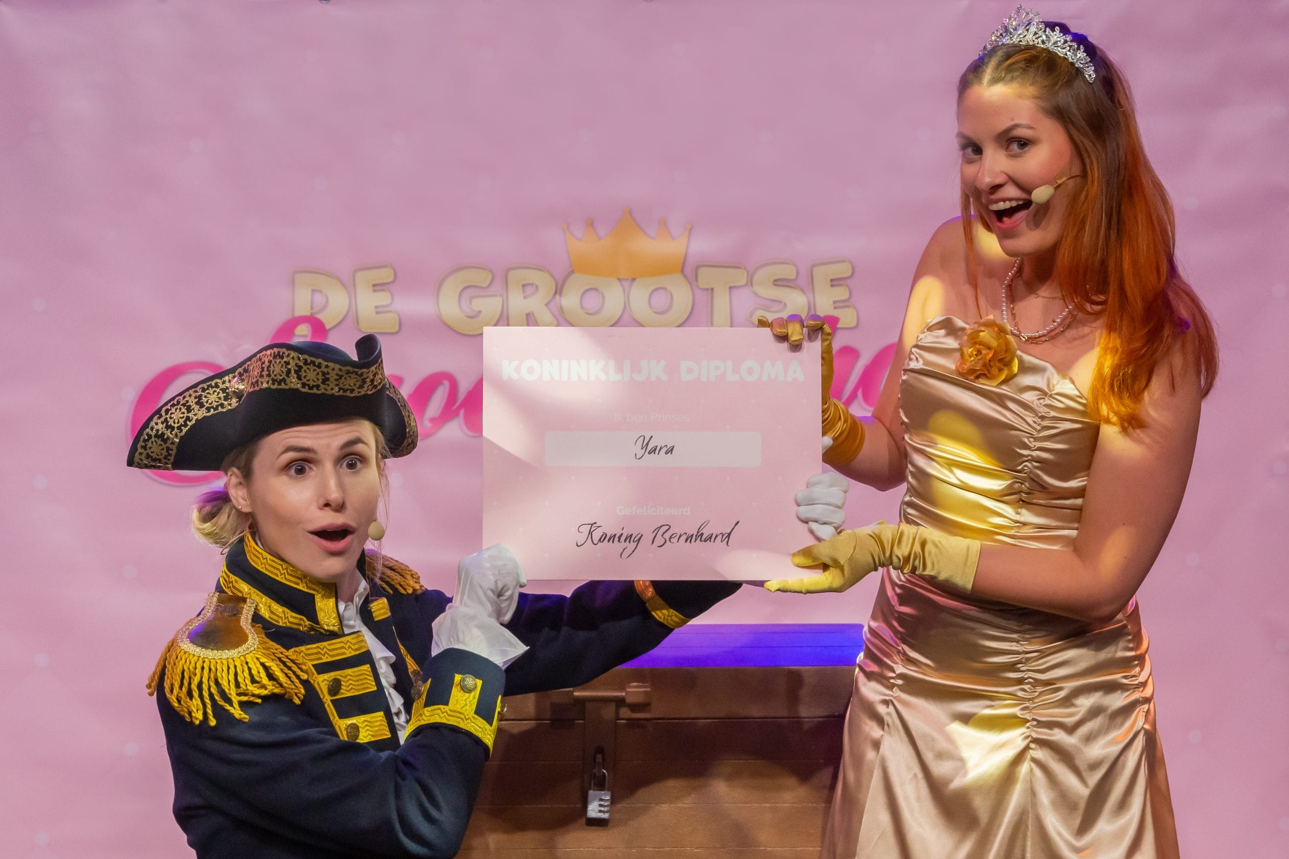 Een écht sprookjesfiguur zijn, wie droomt daar nou niet van? Voor één dag worden de kinderen in de zaal betoverd tot een écht sprookjesfiguur. De opa van Prinses Yara heeft honderden jaren geleden zijn mooiste kroon en de koninklijke diploma’s veilig opgeborgen in een schatkist. De vader van Prinses Yara is het nooit gelukt om de schatkist te openen. Het is nu aan Prinses Yara en Lakei Lux om te proberen de schatkist open te krijgen. Met opdrachten, zingen en dansen doen ze er alles aan om de schatkist te openen. Zou het ze lukken? Als het ze lukt krijgen alle kinderen in de zaal een écht koninklijk diploma.